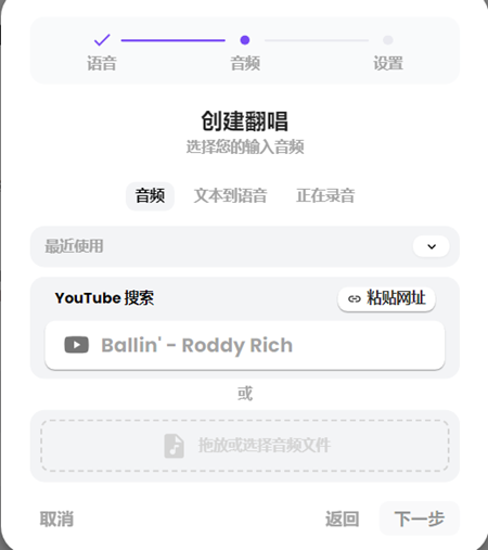 4、它不仅支持歌声翻唱,还可以输入文本转语音,或者直接用麦克风输入语音翻唱,上传音频后,点下一步。