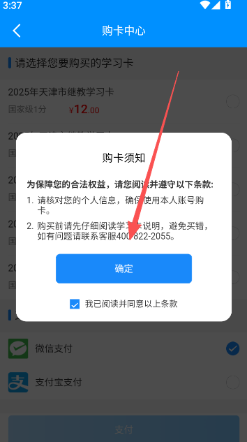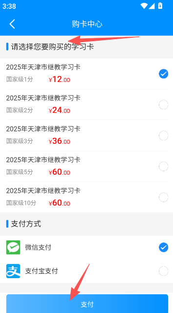 3、选择你要购买的学习卡类型下单支付,以支付宝或是微信的方式完成。