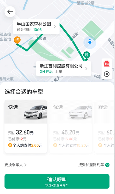 车型选择与企业版类似,但无批量下单功能,主要满足个人出行需求。