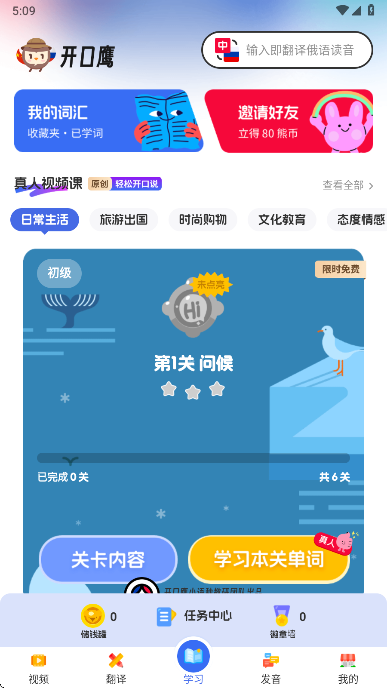 1、在本站下载安装俄语学习app打开,进入首页可以获取到基础学习功能