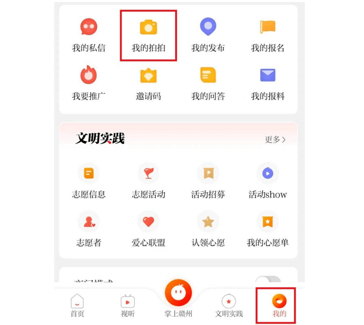 2、在“视听”栏目点击“拍拍”,进入页面后找到“拍客赣州”导航条点击“马上参与”,进入所在的分组上传视频。