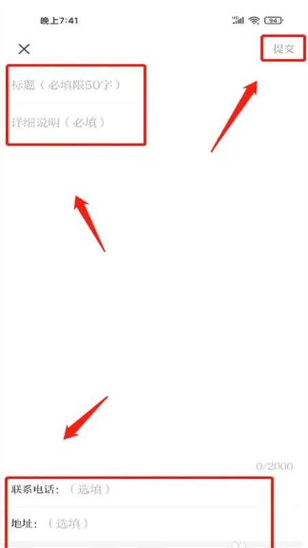 3、进入报料,输入报料标题、报料内容、联系电话、地址、上传图片或上传视频,点击提交即可