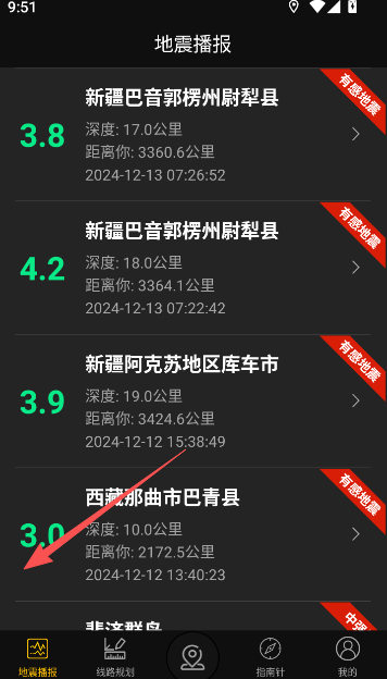 3、根据海拔所呈现的数据不同,还会给出专业的地震播报预警,大家如果身处这些预警提示地点,就请尽快离开。
