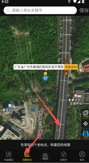 4、如果要规划一条自己要走的行经路线,可通过线路规划的方式完成此项操作,具体可添加两个坐标点,构建线路。