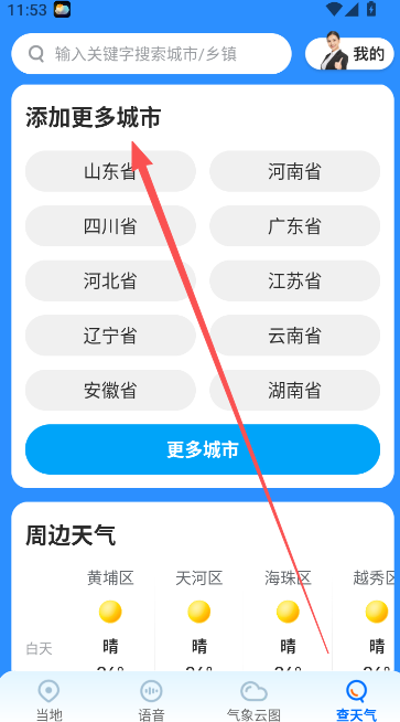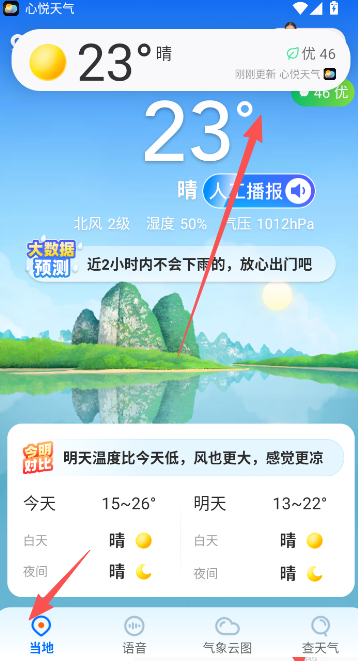 1、首先校准当前所在位置,位置信息获取的越准确,天气信息方面也就展示的更完全。