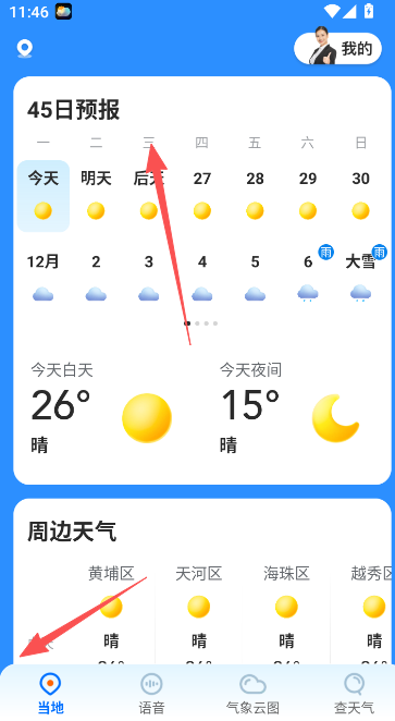 3、下滑页面,还能够看45日的天气预报,以及周边地区的最新天气情况。