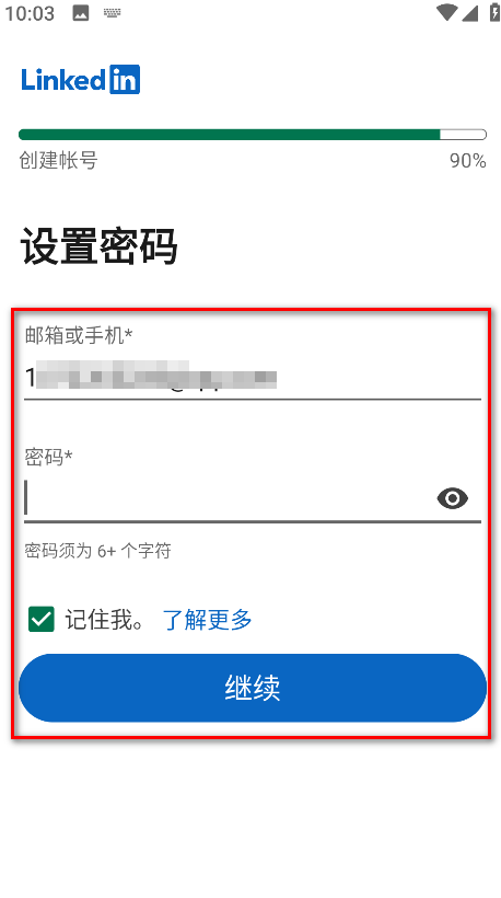 4.设置密码,勾选记住我,然后点击继续。