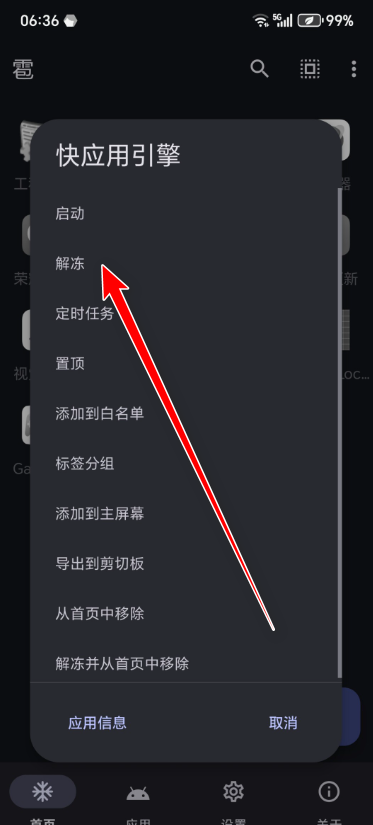 11、点击首页,长按快应用图标,选择冻结