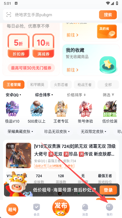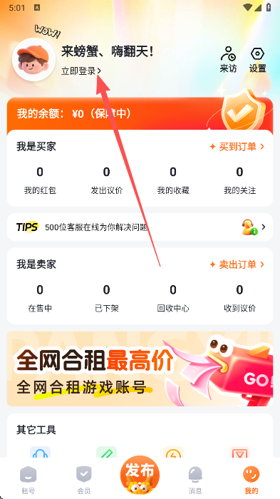 1、在本站下载安装螃蟹租号app打开,直接进入首页