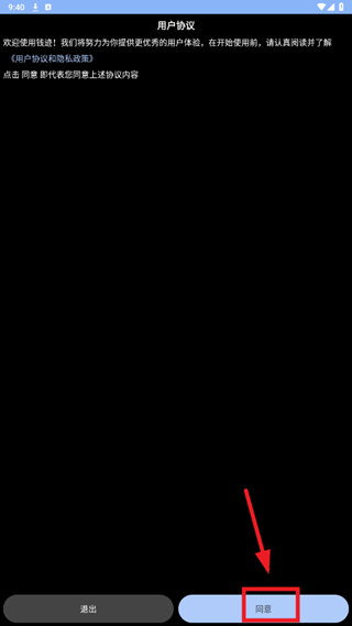 1、打开钱迹手表版,点击同意相关协议。
