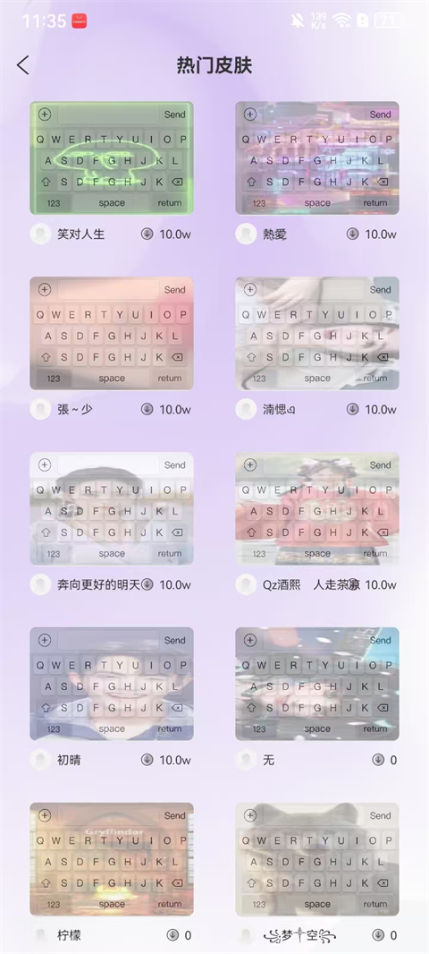 1、在首页界面中浏览热门皮肤区域,点击任意喜欢的键盘皮肤图样,即可进入该皮肤的详情页面。
