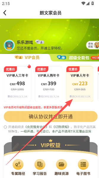2、可以看到一年的会员卡价格为223,确认开通请点击下方选项,完成订单的支付。