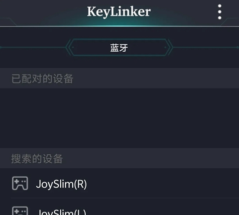 2、打开手机keylinker app,在初始界面下拉刷新进行搜索。此时看到“BLE_JOY”或者“JoySlim”设备,点击设备名称即可连接。(需要分别连接左边或者右边手柄)