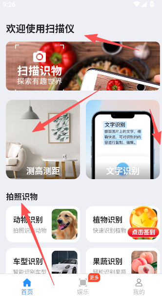1、免注册登录进入软件内容,扫描识物为大家提供:测高测距、文字识别;拍照识物为大家提供:动物识别、植物识别、车型识别、果树识别等,所包含的功能分类非常全面。