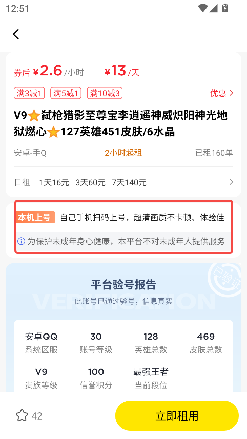 1、价格门槛极低,热门游戏高端账号0.1元起租,支持按小时计费,并推出多小时套餐,最高可享5折优惠,在这里花小钱玩神号。