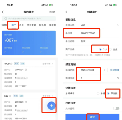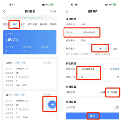 新建商户账号路径:搜电合伙人app-首页-我的盟友-商户,点击右下角"+",设置:填写物业的手机号/或者直接用自己的手机号(1个手机号只能开3个商户账号),选择需要开启会员的商铺,设置分成比例为0(如果需要给物业分成,那就按实际的比例填写),分摊方式选择不分摊,点击确认即可。