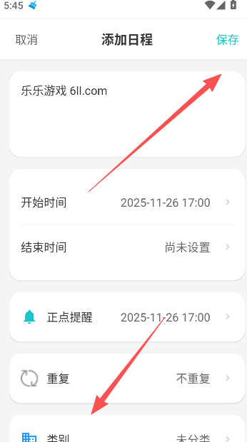 2、在日程信息编辑栏目中输入内容,选择开始和结束时间,并设置类别,完成以后保存即可。