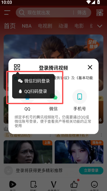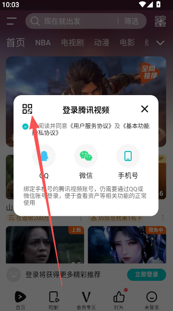 2、在登录腾讯视频页面点击上方的二维码选项。