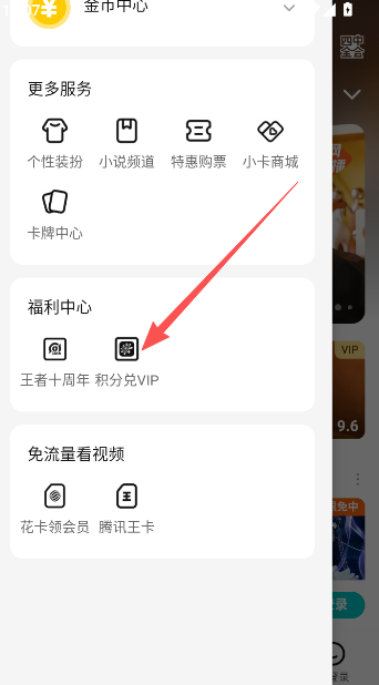 2、下滑菜单列表,在福利中心选择积分兑VIP。