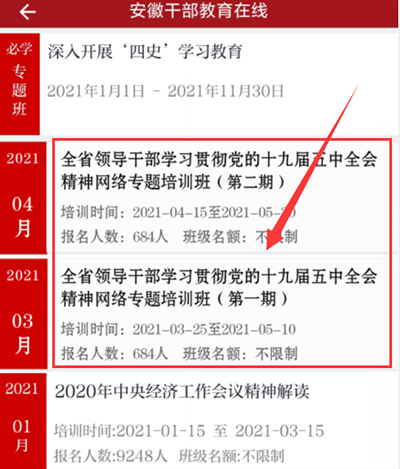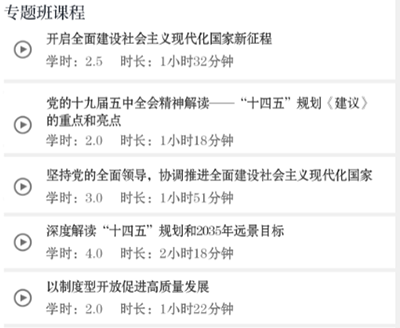 点击专题班,选择“全省领导干部学习贯彻党的十九届五中全会精神网络专题培训班(第一期)”或“全省领导干部学习贯彻党的十九届五中全会精神网络专题培训班(第二期)”,进入专题班。
