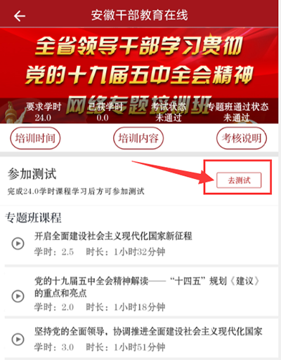 学员完成至少24学时的课程学习后方可点击“参加测试”按钮参加测试。测试通过即完成专题班学习任务,如测试未通过可再次参加测试。完成专题班学习任务后可获得专题班结业证书,专题班结业证书可进入个人中心,在我的证书中查看。