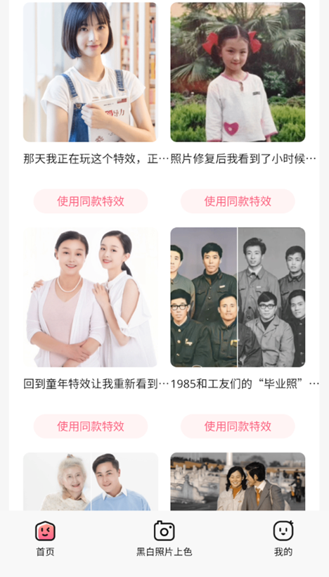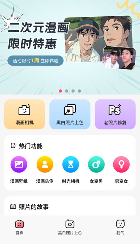 拍照特效相机软件为您提供炫酷多样的特效工具库,为您提供AI漫画相机,多种二次元效果,带您一秒穿越漫画世界,还有专业的老照片修复上色工具,让您的照片一键变清晰,多功能智能处理工具,集漫画相机、老照片修复、黑白照片上色、照片时光机、性别转换、卡通头像、漫画壁纸、照片风格化、AI漫画等多种功能于一身,为您的照片带来全新的体验和创意!