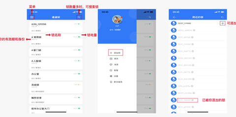 在【附近的锁】页面下,右侧有「+」号的锁表示可添加,点击「+」,手机蓝牙和锁蓝牙通信,通信成功即可添加。