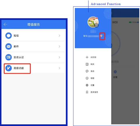 (2)点击App「≡」-账号后方图标,进入「高级功能」页面。