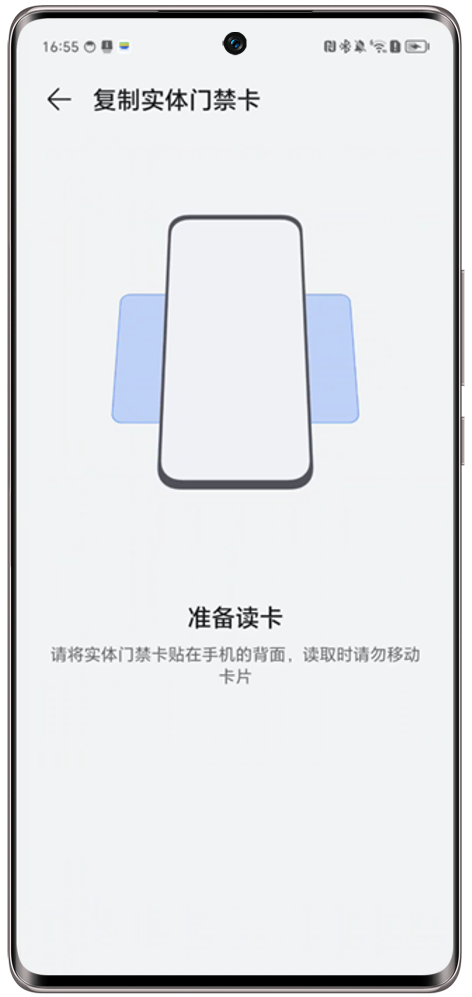 2、选择复制实体门禁卡,将实体门禁卡贴在手机背面进行读卡,读卡完成后等待写卡。