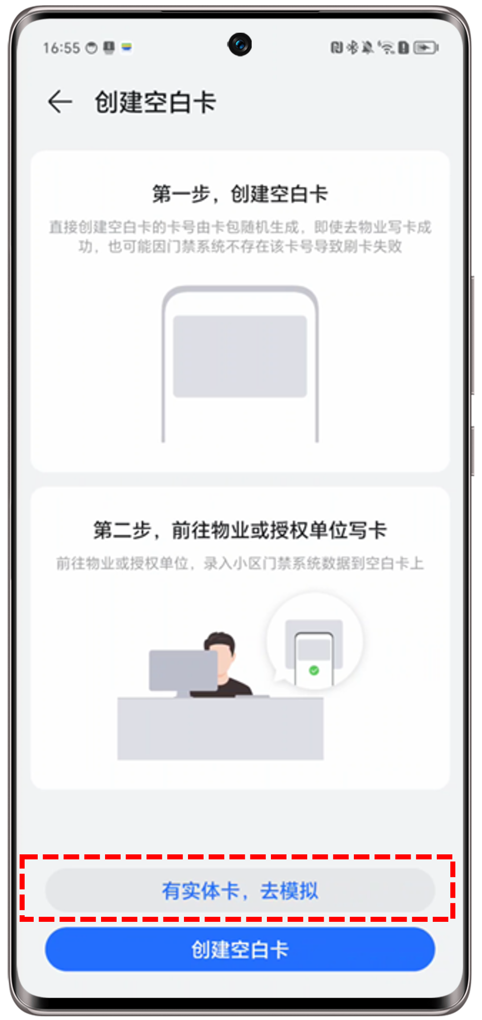 有实体卡:点击有实体卡,去模拟后,按照新页面提示将实体卡片贴近手机并进行操作。