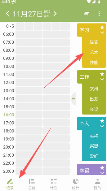 1、记录,主要对用户的个人生活、工作以及学习方面进行详细记录,时间线上有详细的划分。