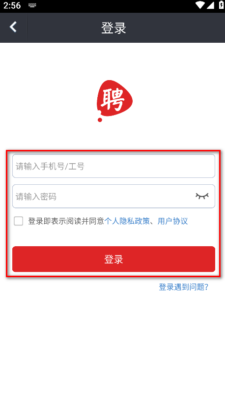 3.输入手机号或者工号、密码,勾选登录即表示阅读并同意个人隐私政策、用户协议,再点击登录。