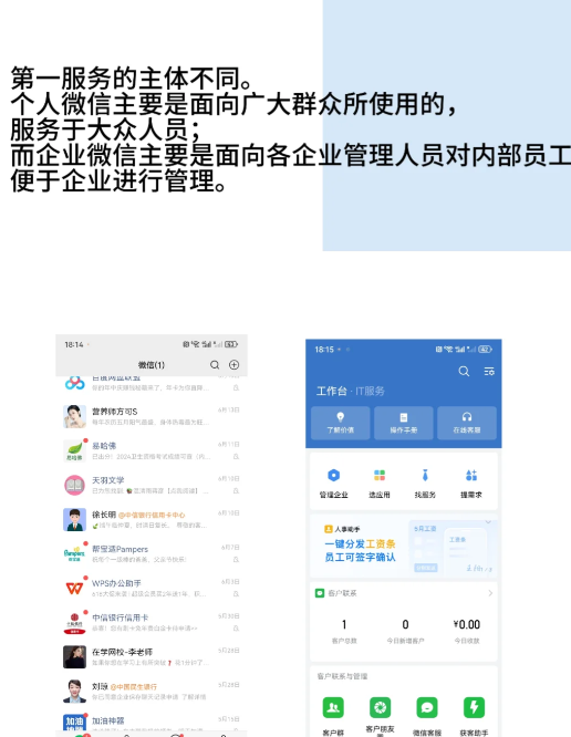 个人微信主要是面向广大群众所使用的,服务于大众人员;而企业微信主要是面向各企业管理人员对内部员工,便于企业进行管理。