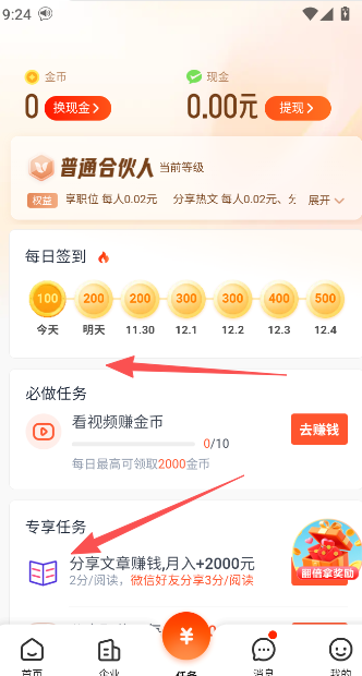 3、参与必做任务的看视频赚金币和分享文章的方式赚取收益。