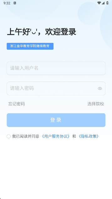 2、学员登录:输入用户名和密码,查看并勾选《用户协议》和《隐私协议》,点击登录,进入首页。用户名为学员学号,密码默认为学员身份证后六位;