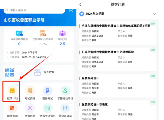 3、进入首页后可在“教学计划”看到自己当前学期需要学习的所有课程及学分。