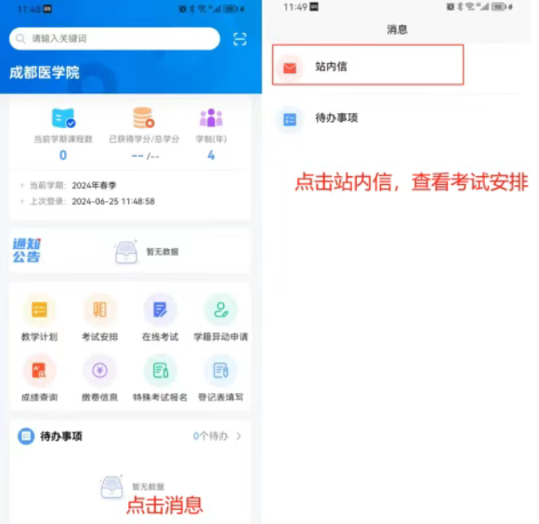 2、点击消息中的站内信查看线下考试的考场、考试时间、座位号等;