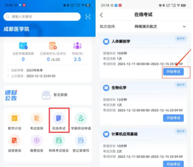 3、点击进入【在线考试】,查看个人考试科目详情。