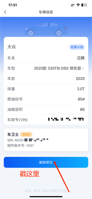 设备支持每次绑定一台车,其他车型使用可以先解绑当前车辆,再重新激活绑定设备。解绑车辆步骤:进入App➡我的➡车辆管理➡解绑车型。