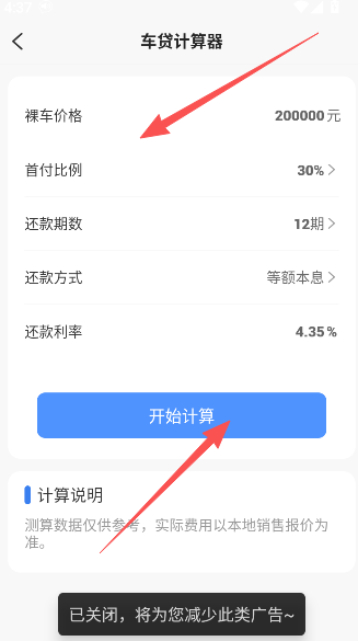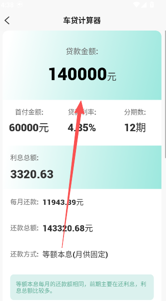 2、在车贷计算器页面内,按照:裸车价格、首付比例、还款期数、还款方式以及还款利率进行计算。