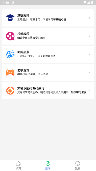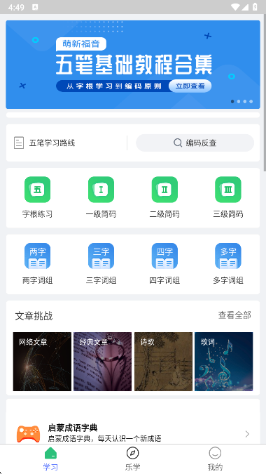 1、在本站下载安装五笔学习app打开,在学习页您可以任意选择性进行学习操作