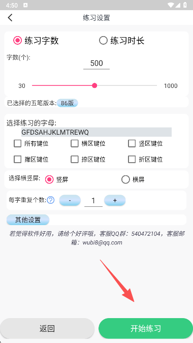 2、进入字根练习,可以设置练习参数,点击开始练习