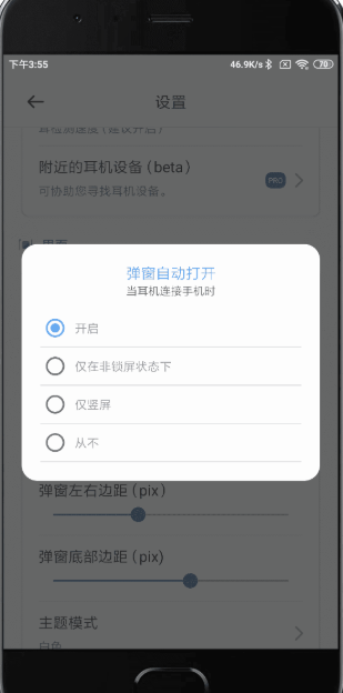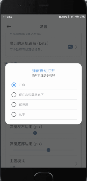 开启:开启弹窗自动打开功能后,当检测到充电仓被打开,会弹出主界面,并显示耳机信息