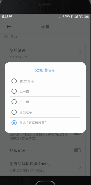 可以选择双触摸对应的功能:播放/暂停、上一首、下一首、语音助手、默认(原耳机设置)