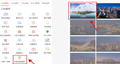 第一步:职工个人通过乐乐游戏下载“杭工e家”APP,完成注册成为认证会员后,点击“区县技能激励”选择“上城区”申报页面。具体操作图示如下: