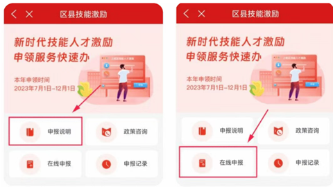 第二步:在“上城区新时代技能人才激励”页面中,请先阅读“申报说明”,符合申报条件者请点击“在线申报”。具体操作图示如下: