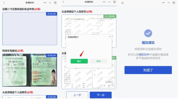 上传成功的材料,右上角会显示“上传成功”字样。上传完成并确认无误后点击[下一步]进行提交。