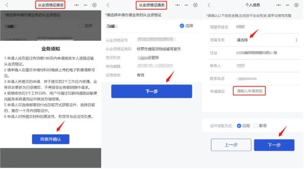 用户在小程序完成注册登录和实名认证后,可通过身份证号自动关联已有的从业资格信息。认真阅读从业资格证换发业务须知后,您可以点击[同意并确认],进入选择申请办理业务的从业资格证信息页面,确认本人道路运输从业资格证在有效期内且信息未发生变化,选择需要办理业务的从业资格证,点击进入[下一步]完善个人信息。