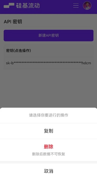 1、登录硅基流动(网址:http://siliconflow.cn/),点击右上角三条横线,选择新建密钥。