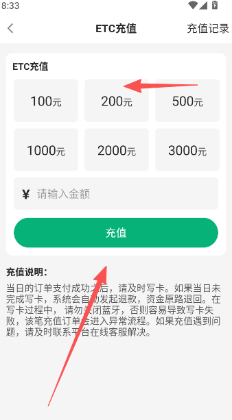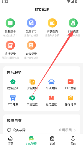 1、在易行通ETC管理页面,点击ETC充值选项。